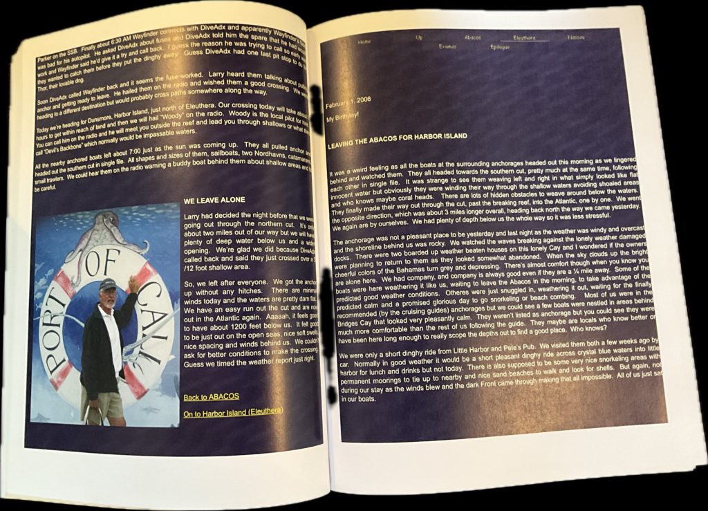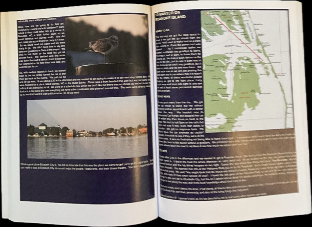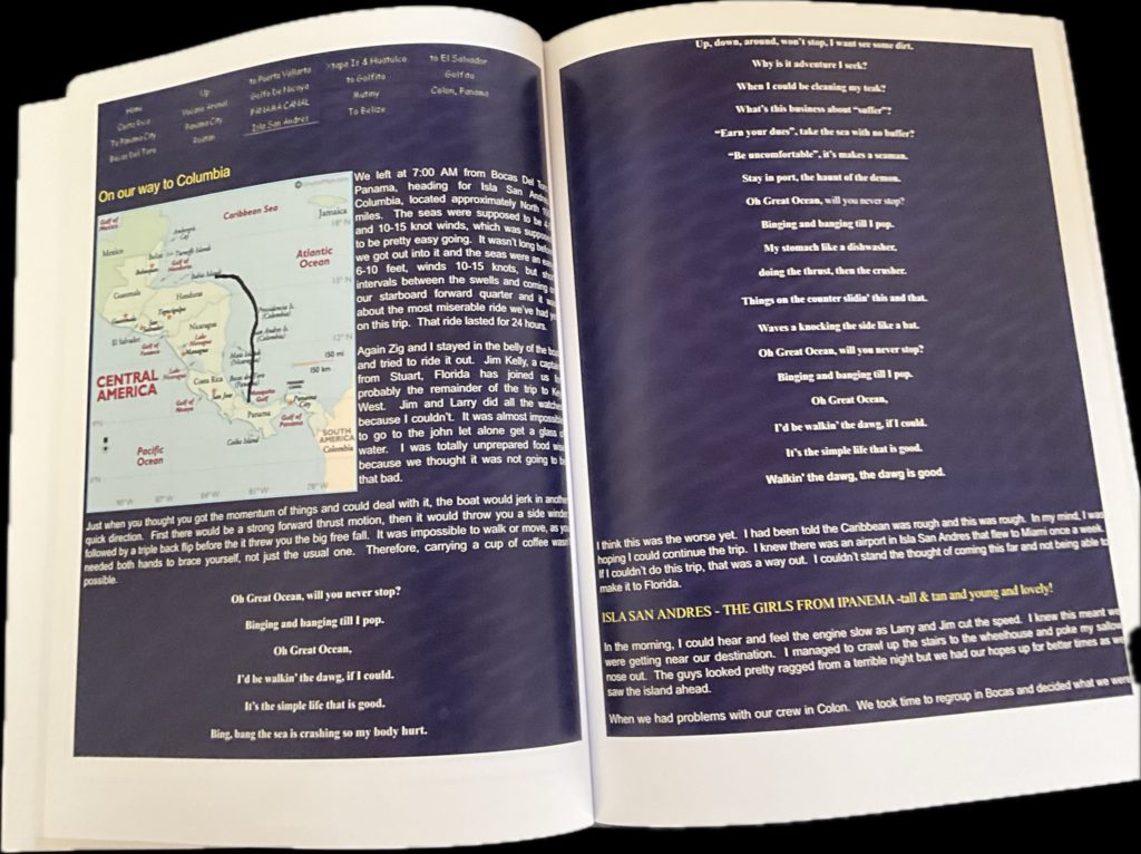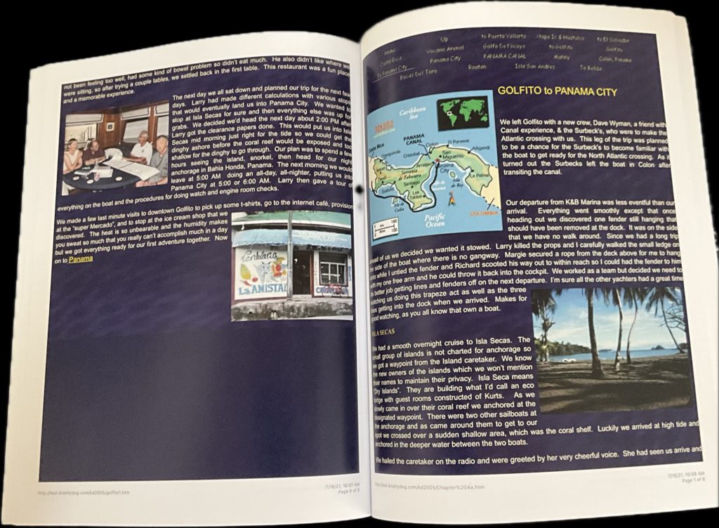 All of these books are unedited copies (for preservation) of the logs of our voyages and travels, posted on our web site (KnottyDog.com) 25 plus yeas ago for friends, before FaceBook and other social media arrived. Books are 8.5×11 , color , on flat paper
